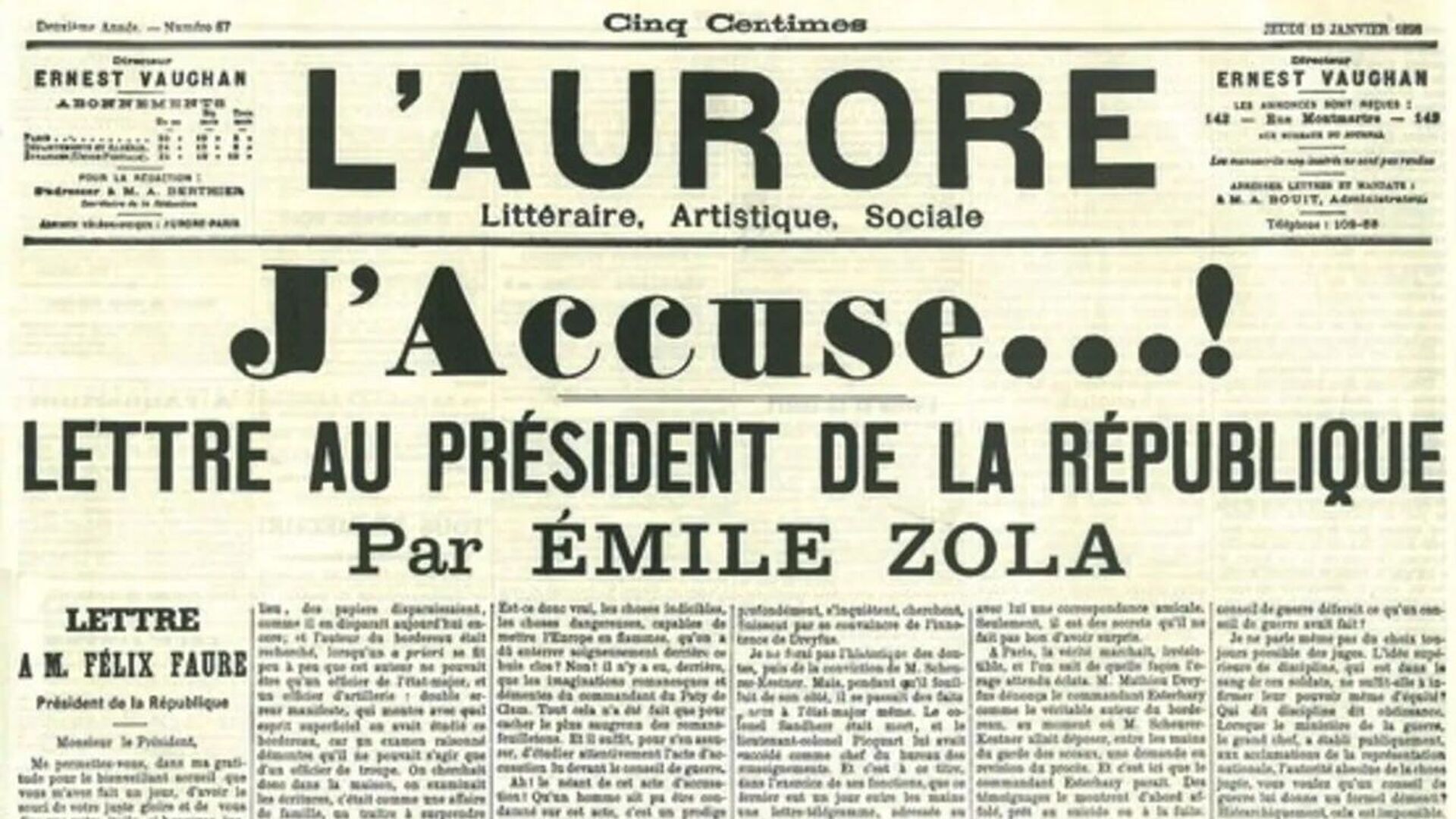 La mentira había avasallado, derrotado y hundido en el fango a la verdad. La mentira campaba como producto del interés y no de la indagación. Entonces Emile Zola en L'Aurore publicó su famoso artículo: Y'Acusse. Lo tengo ahora delante de mí. Ocupa toda la portada a seis columnas y letra minúscula. Es un alegato inmenso y profundo sobre la presunción de inocencia y la manipulación de la verdad para darle luz a la mentira. El artículo, publicado el 13 de enero de 1898, dirigido a monsieur Felix Fauré, presidente de la República Francesa, causó conmoción en toda Francia. Quedó al descubierto una trama de corrupción y ocultamiento de la verdad en el caso del capitán Alfred Dreyfus.